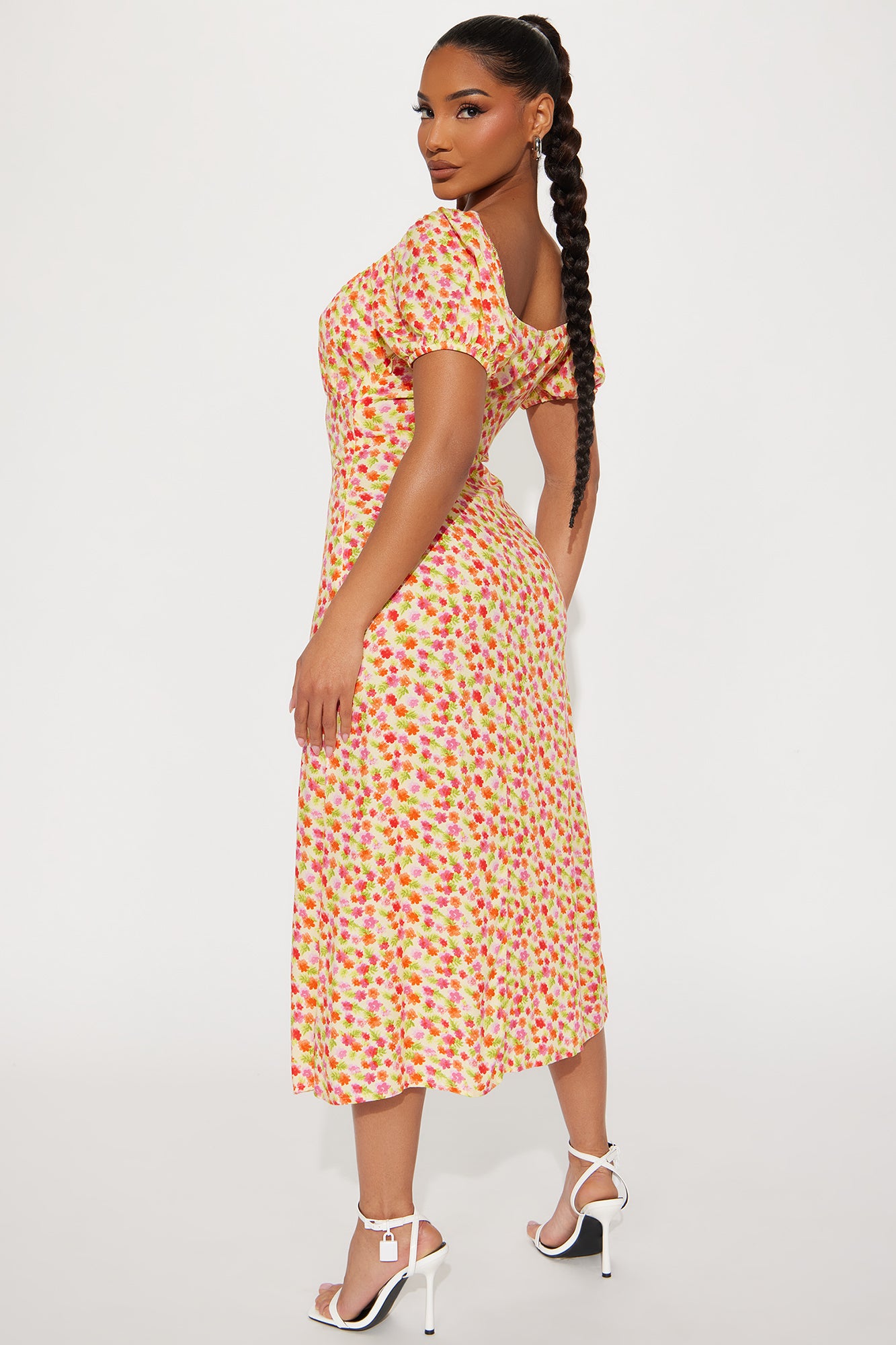 Available In White/Blue And Yellow/combo. Floral Midi Dress V-neck Short puff sleeves Tie front Slit Disclaimer Print Placement May Vary 100% Rayon Imported |