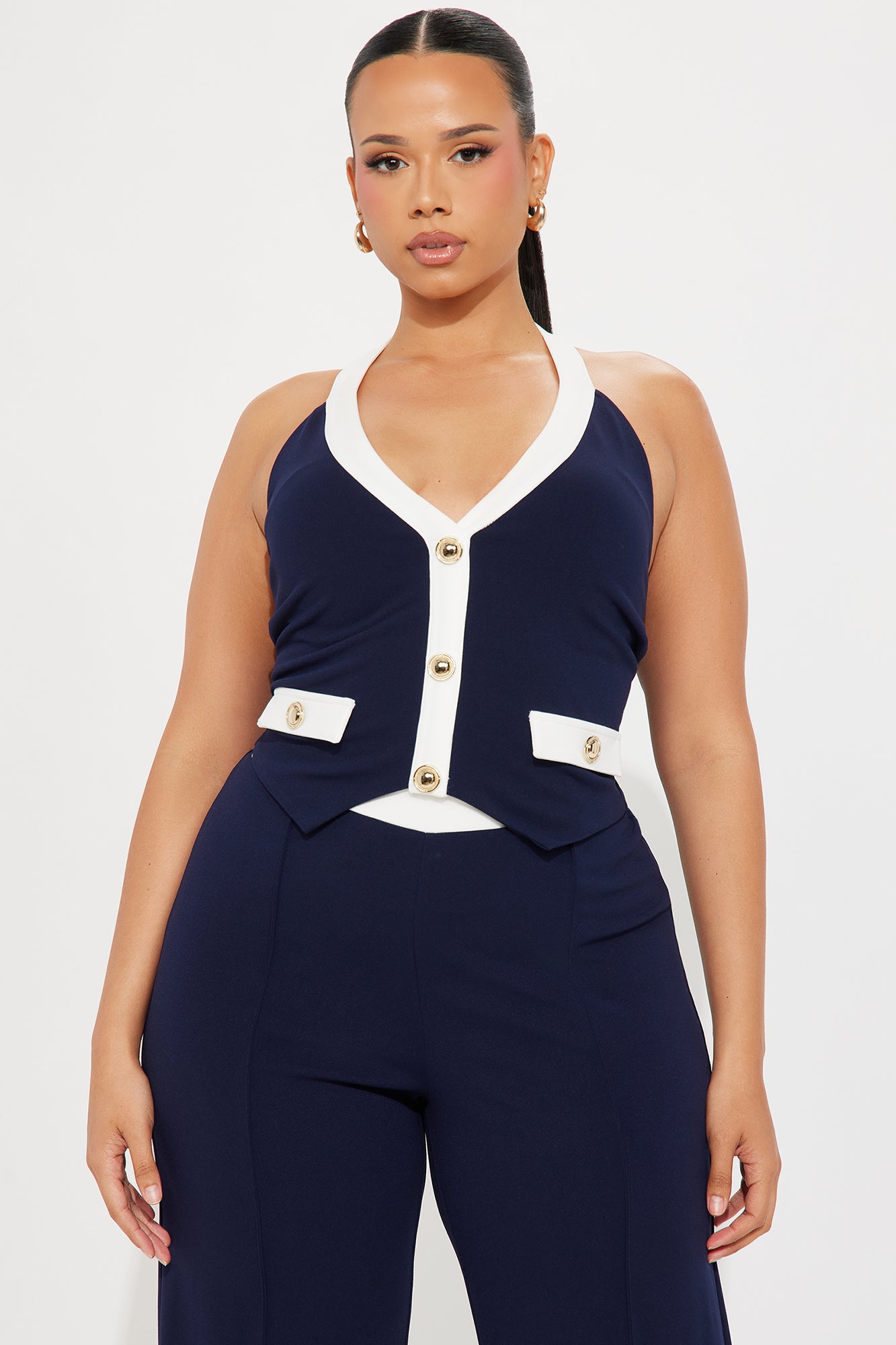 Available In Navy/combo, Kelly Green, And Pink/combo. Halter Vest Top And Wide Pant Set Stretch 34.5" Inseam Elastic Waistband Self: 95% Polyester 5% Spandex Imported |