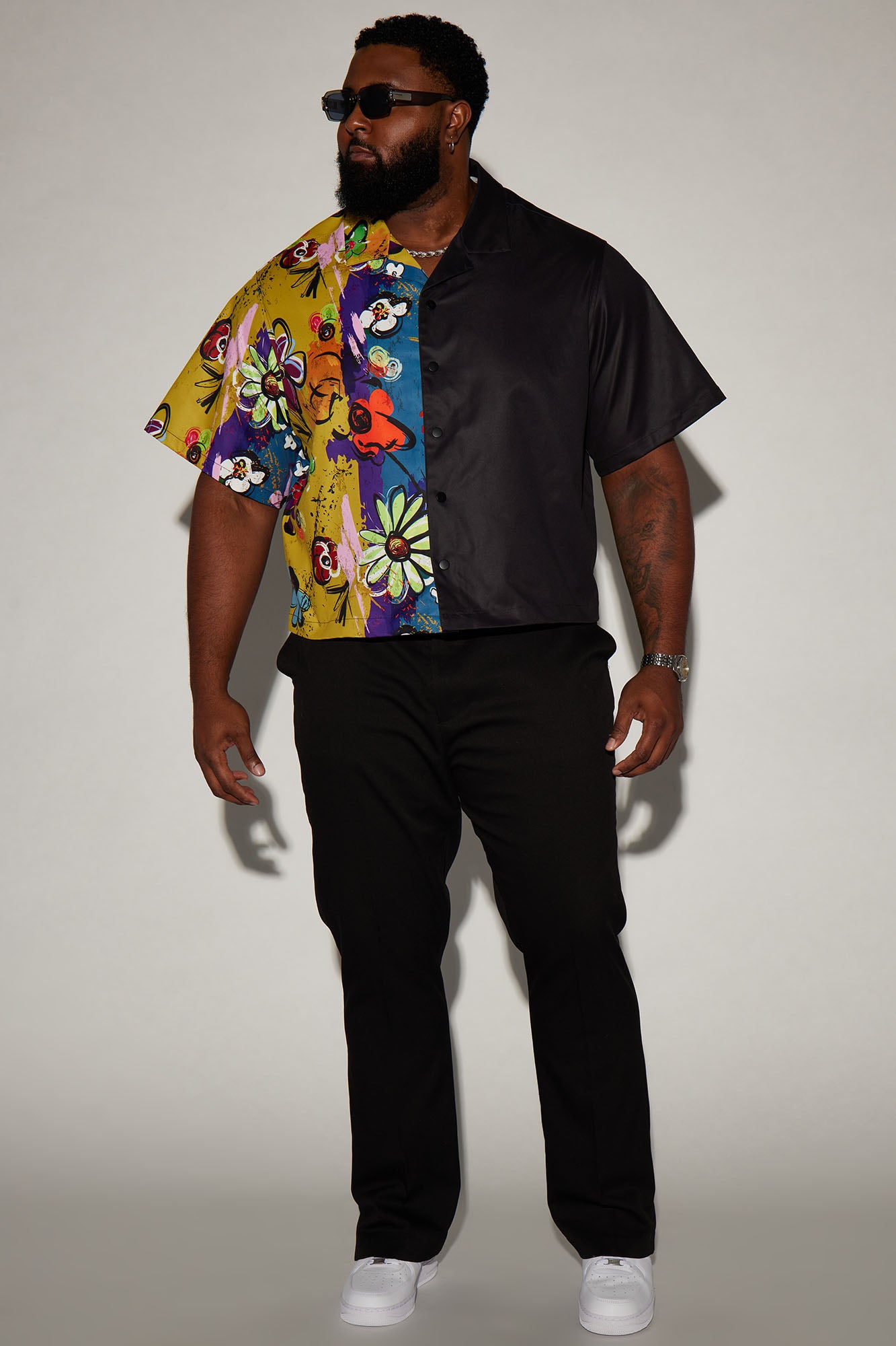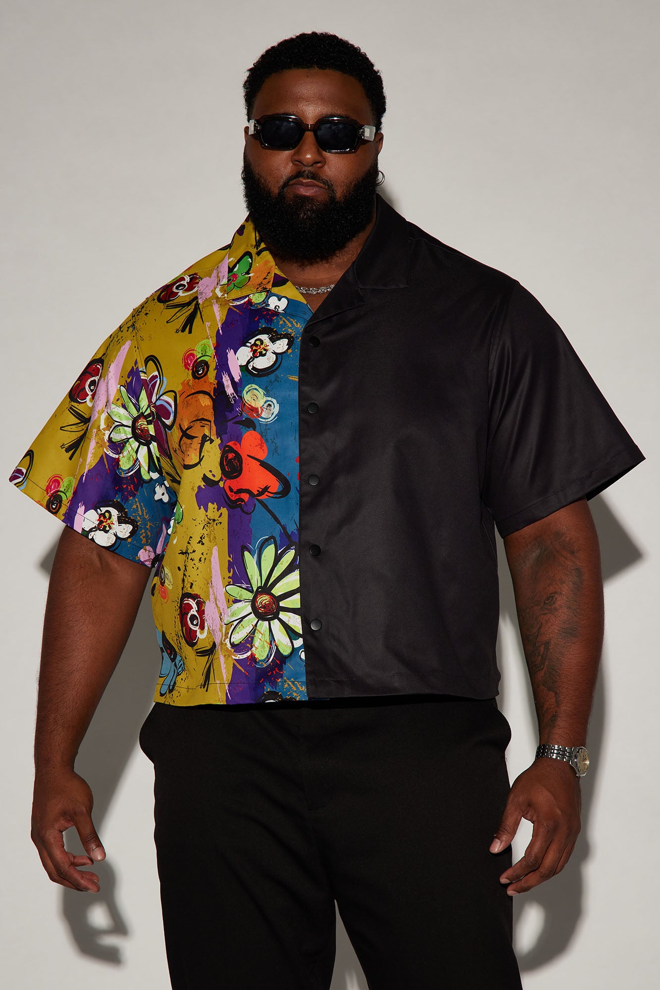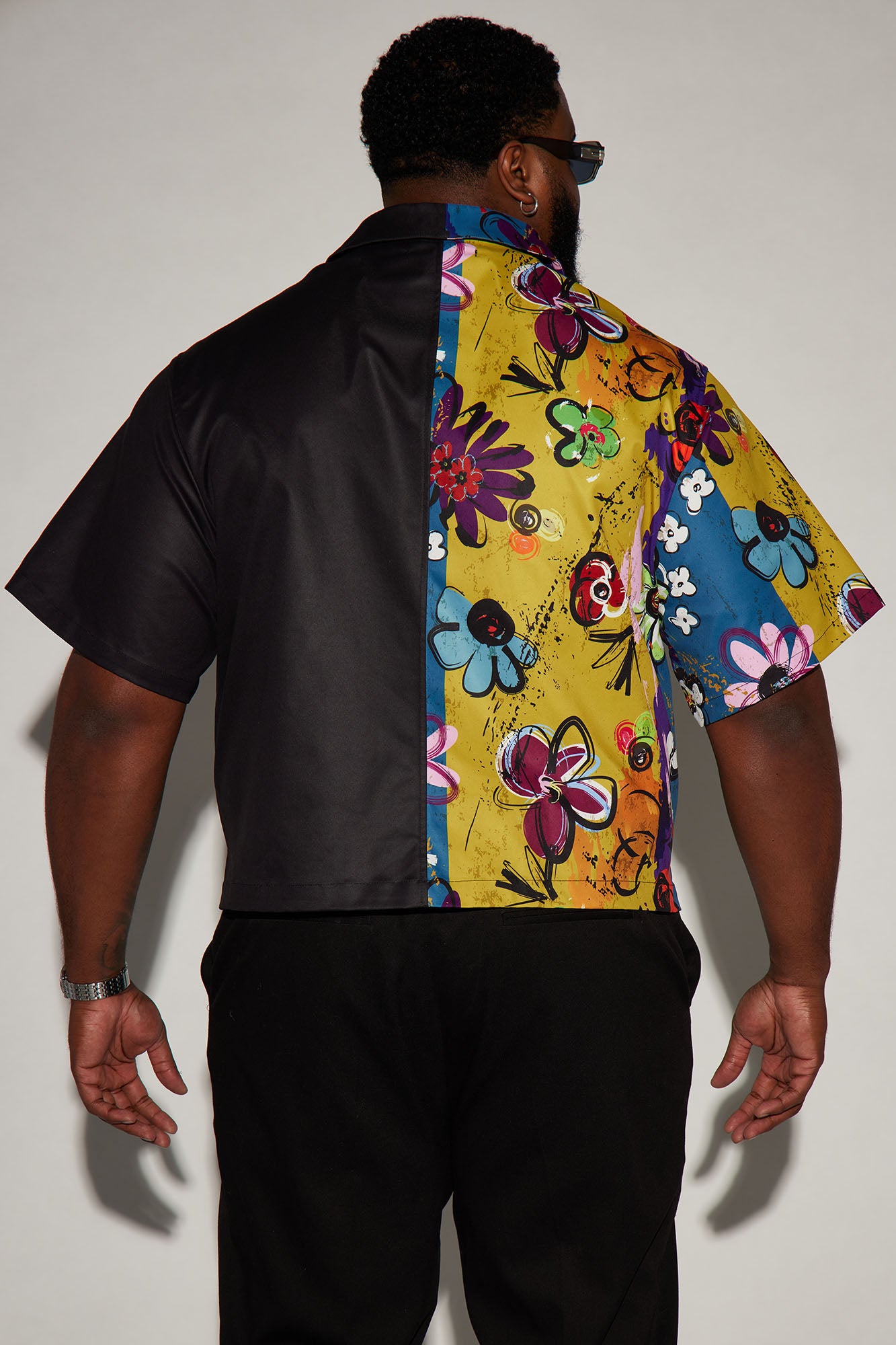 Available In Navy/Multi. Fold Down Collar Front Button Closure Colorblock Detail Bottom Side Slit Short Sleeve Disclaimer: Print Placement May Vary. Shell: 100% Polyester Imported |