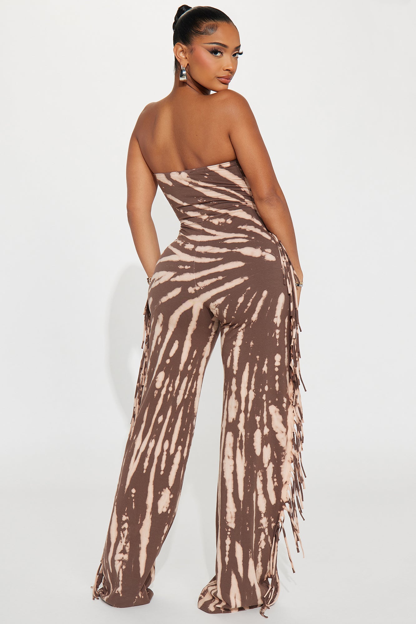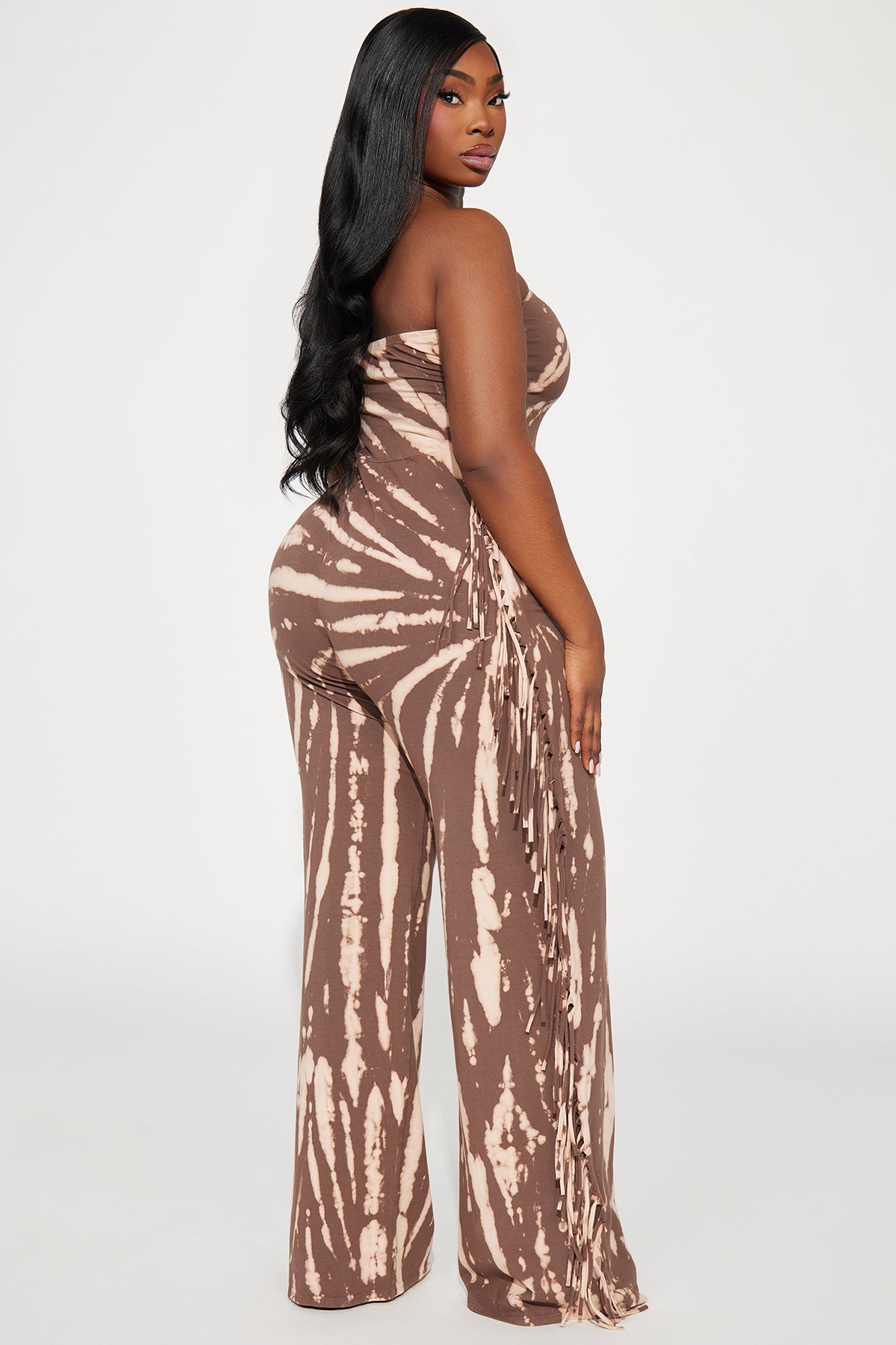 Available In Brown/combo. Tie Dye Jumpsuit Strapless Straight Fringe Trim Wide Leg Stretch Inseam= 33" Disclaimer: Due To The Specialized Dye Process, Each Garment Is Unique 95% Cotton 5% Spandex Imported |