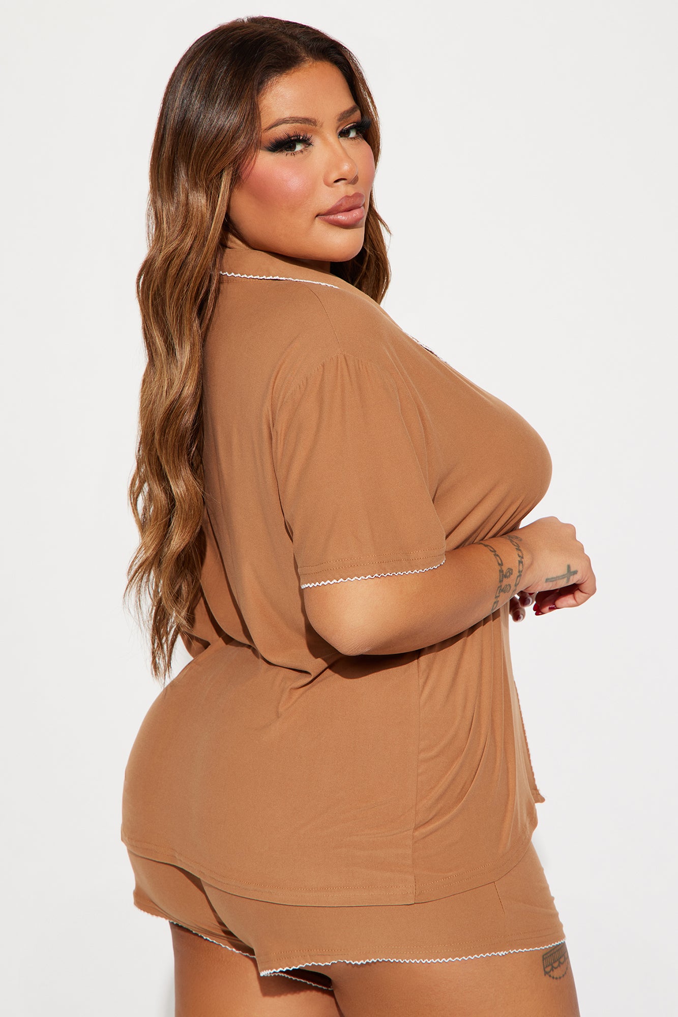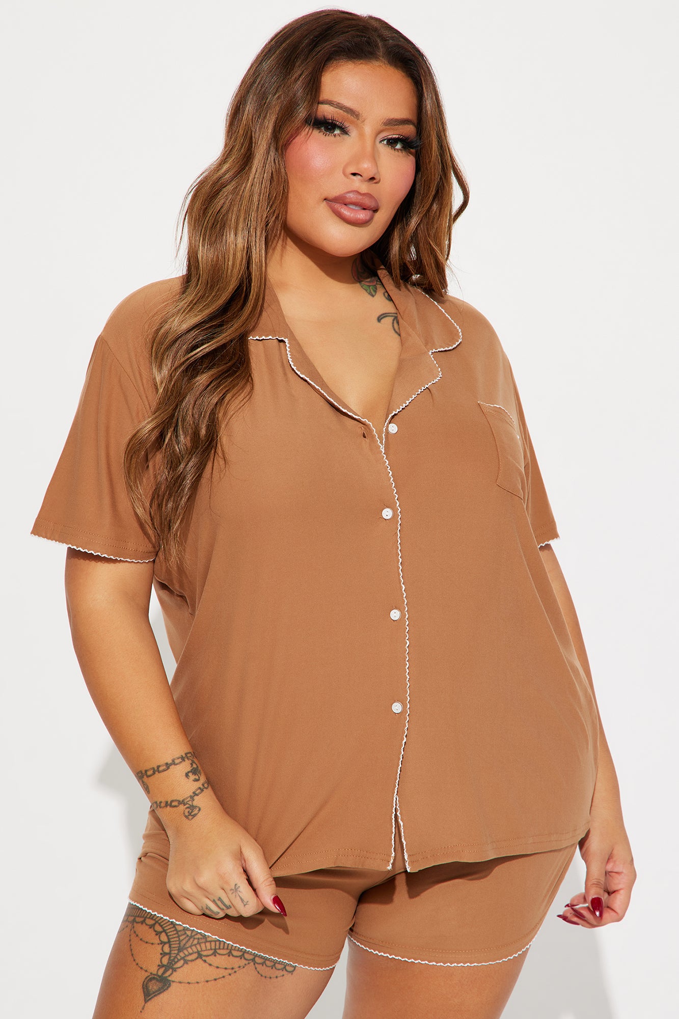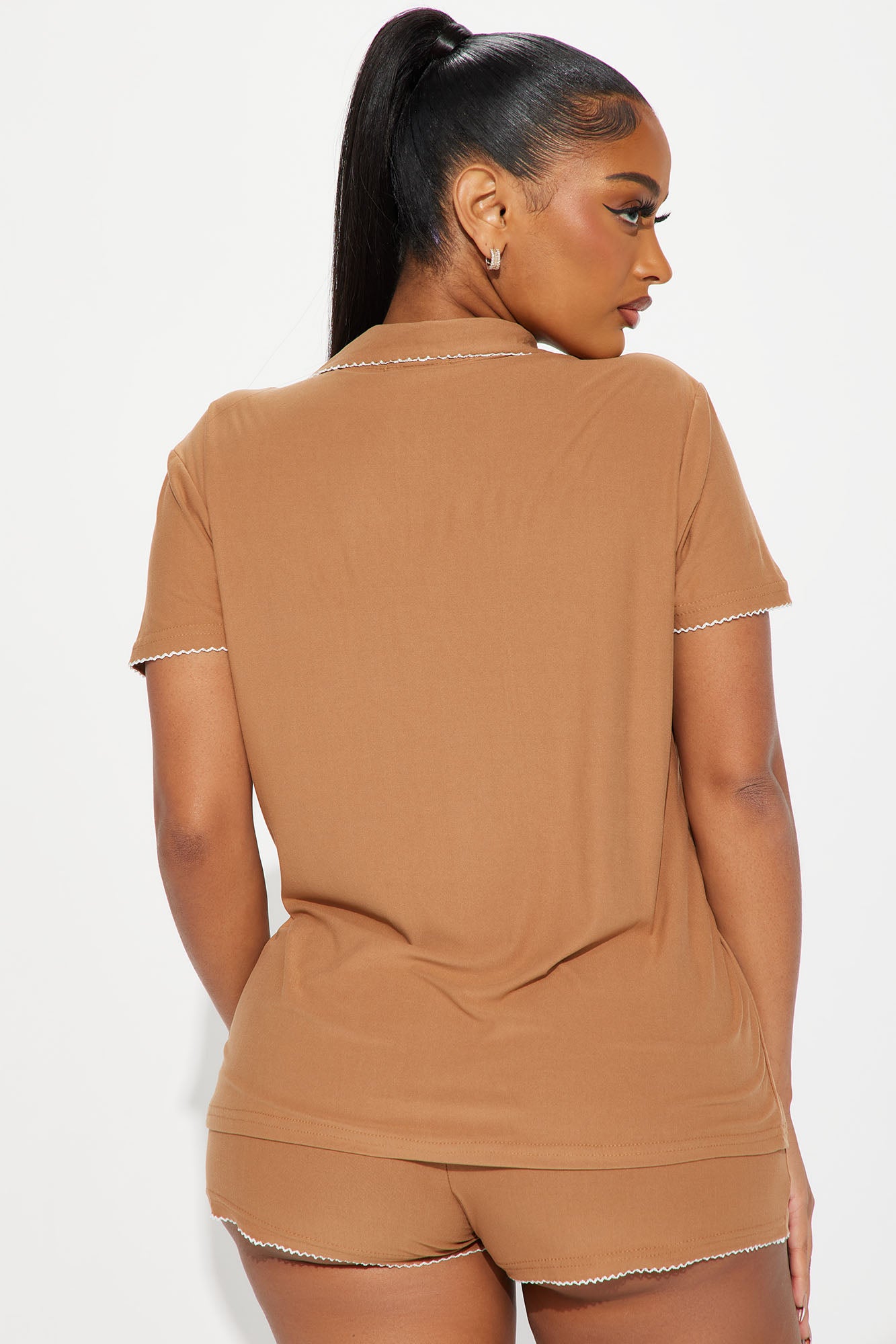 Available In Pink And Tan. PJ Short Set Short Sleeve Collared Top Button Down Front Booty Short Final Sale 95% Polyester 5% Spandex Imported |