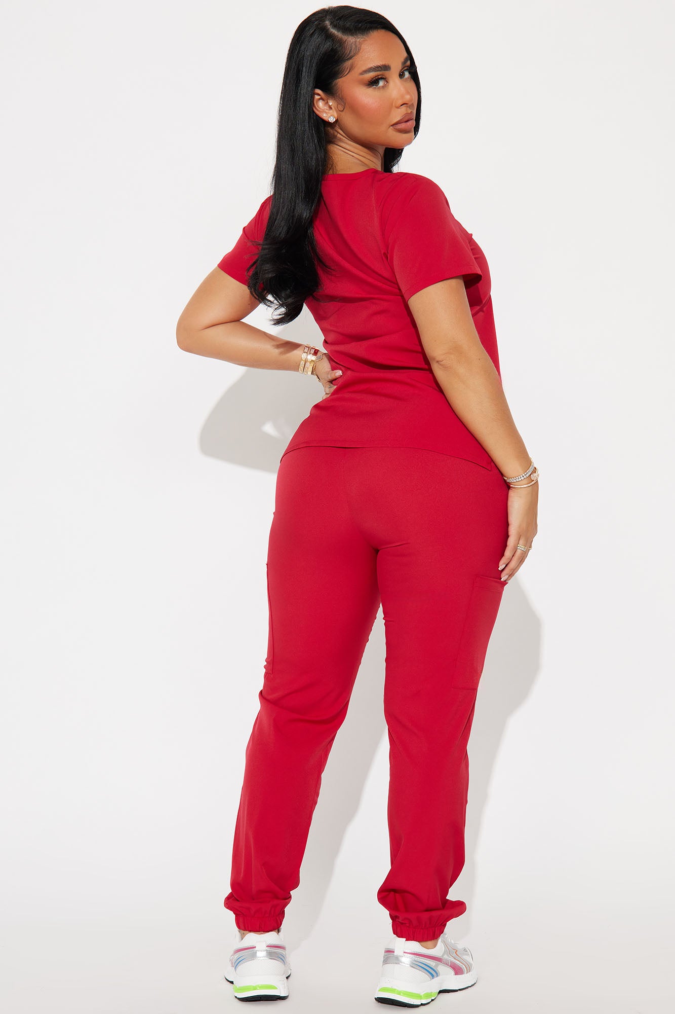 Available In Charcoal And Red. Uniform Scrub Set V Neck Scrub Top Chest Pocket 2 Front Deep Hand Pockets Jogger Pants With Side Pockets Elastic Waistband Breathable Fabric 95% Polyester 5% Spandex Imported |