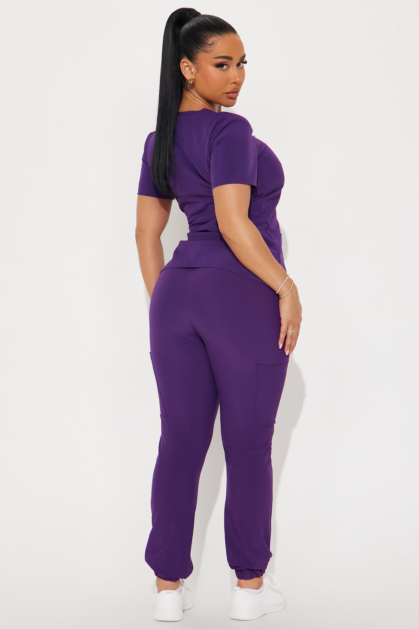 Available In Eggplant, Charcoal, And Magenta. Uniform Scrub Set Short Sleeve Top V Neck Matching Joggers Drawstring Waistband Pockets Stretch 93% Polyester 7% Spandex Imported |