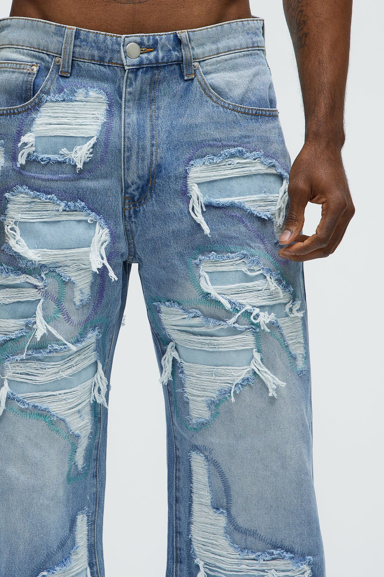Available In Light Wash. Rigid Denim Baggy Fit Zip Fly Button Closure 5 Pocket Detail Ripped And Repair Stitch Detail 100% Cotton Disclaimer: Due To The Specialized Wash & Distressing Process, Each Garment Is Unique. Imported |