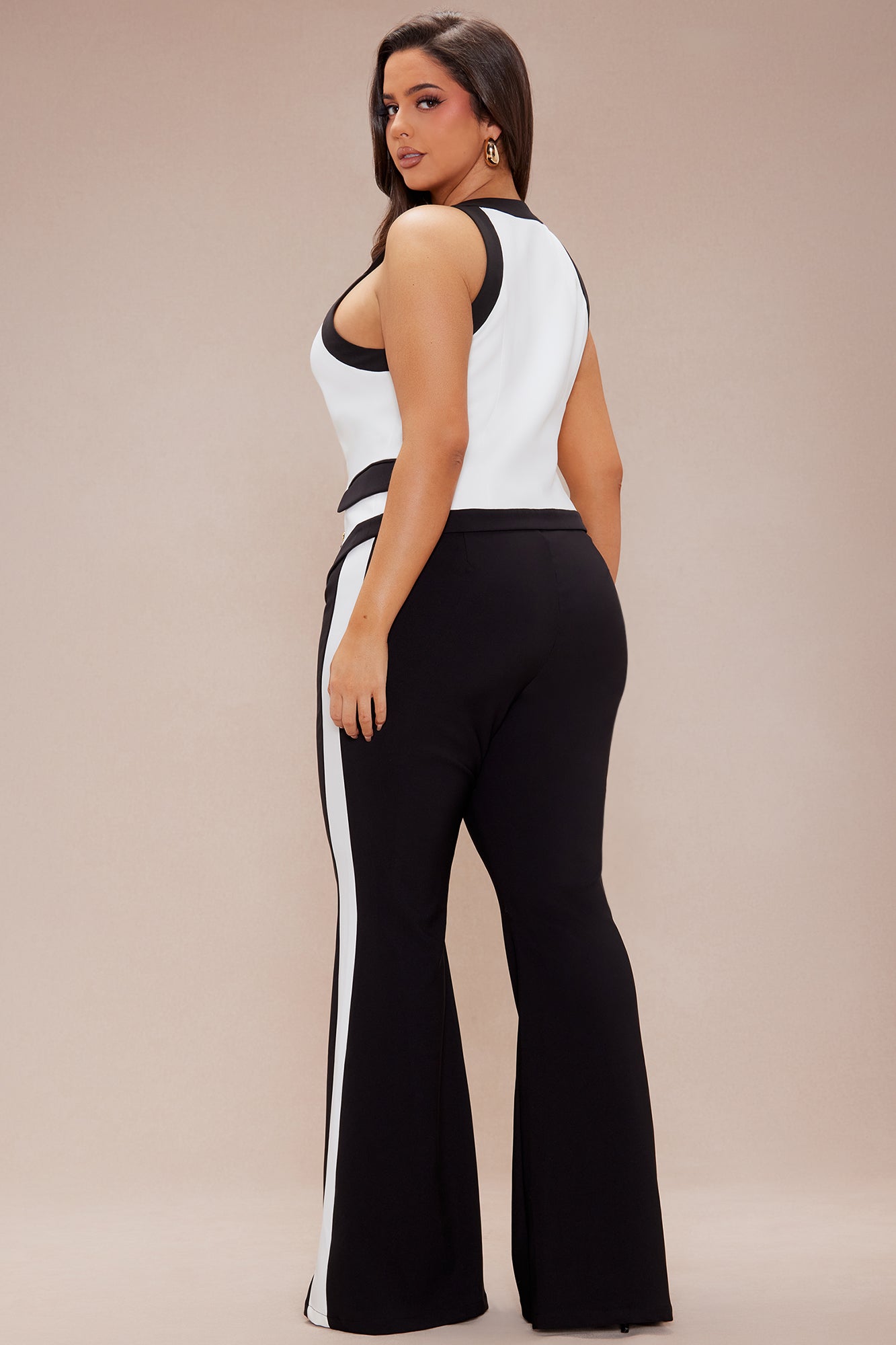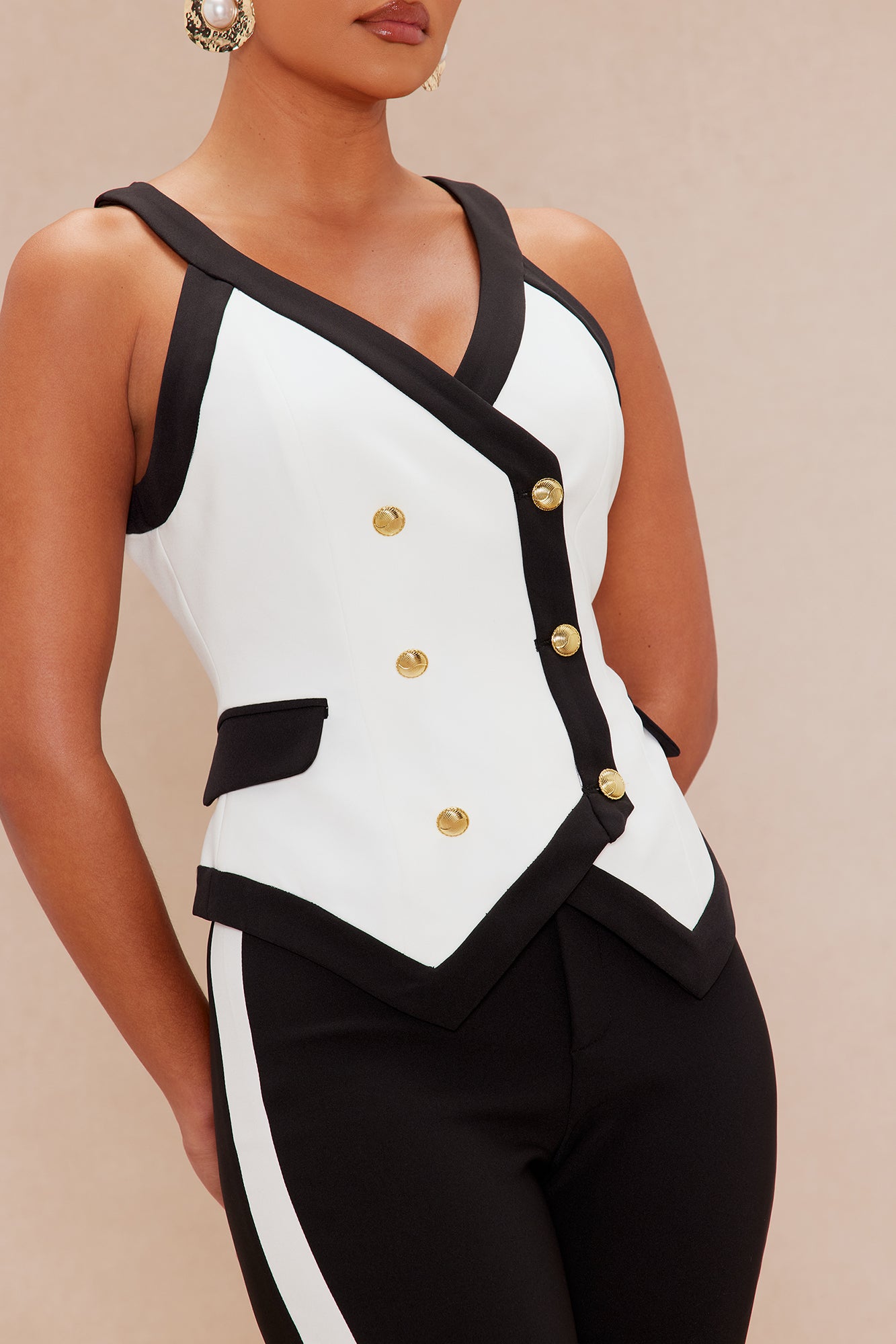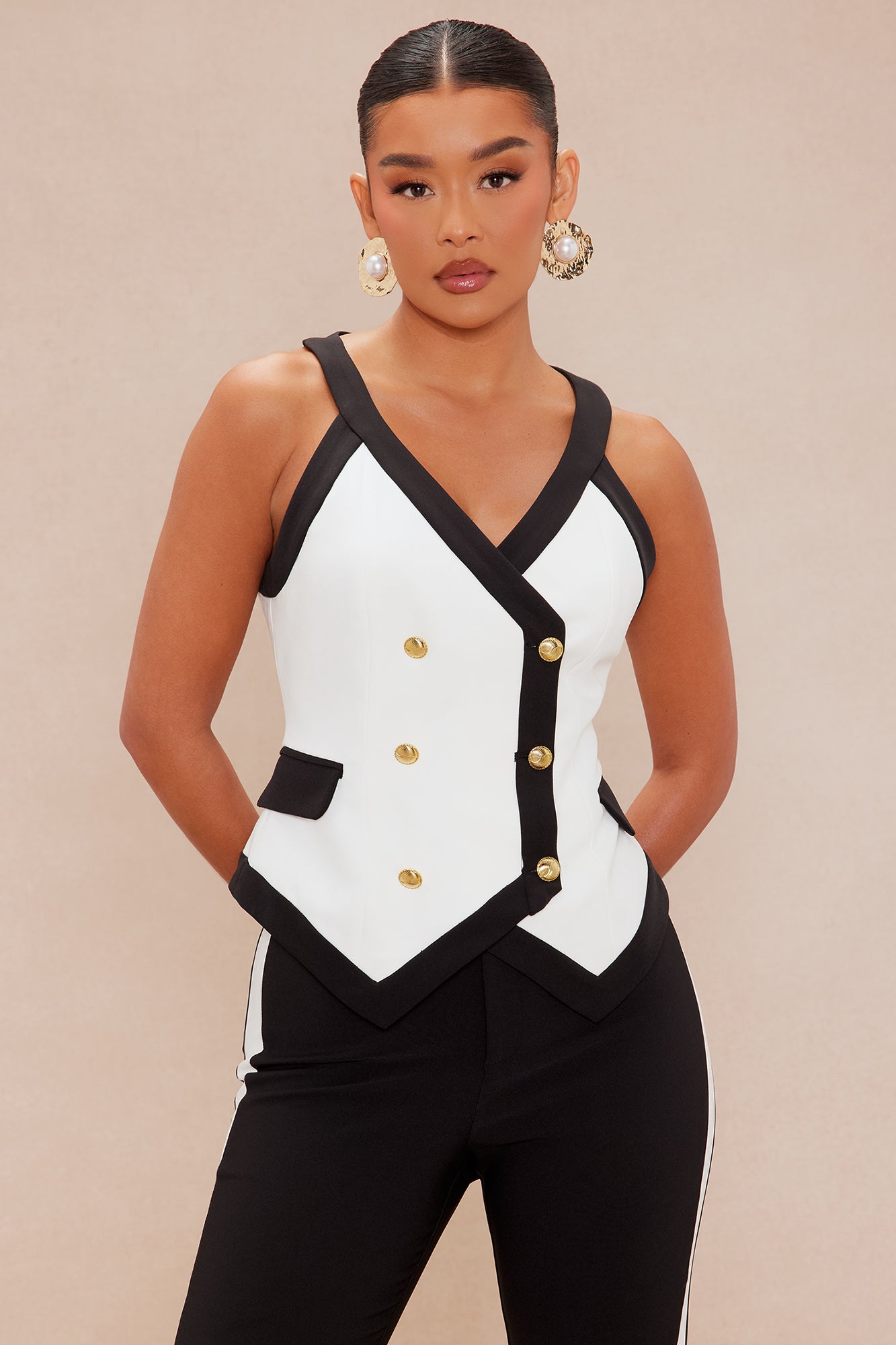 Available In Black/White. Vest V-Neck Sleeveless Button Up Closure Wide Leg Pant Front Zipper Closure Contrast Trim Detail Stretch Shell1 & 2: 95% Polyester 5% Spandex Liming: 95% Polyester 5% Spandex Imported |