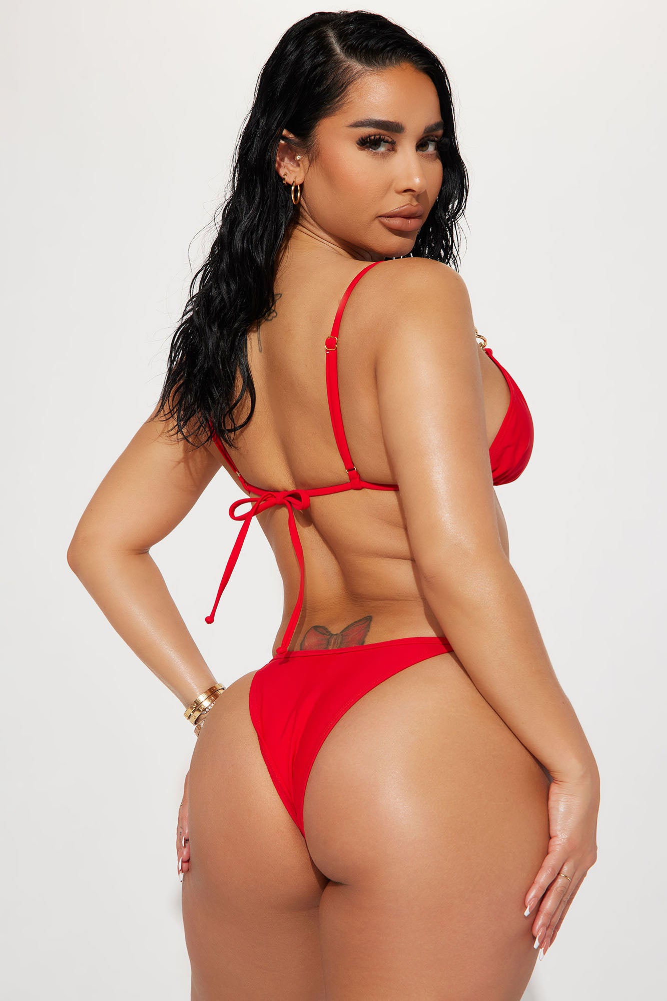 Available In Black And Red. 2 Piece Bikini Triangle Top Adjustable Back Tie Cheeky Bottom Moderate Back Coverage Chain Detail Full Stretch Final Sale Shell: 80% Nylon 20% Spandex Lining: 90% Polyester 10% Spandex Imported |