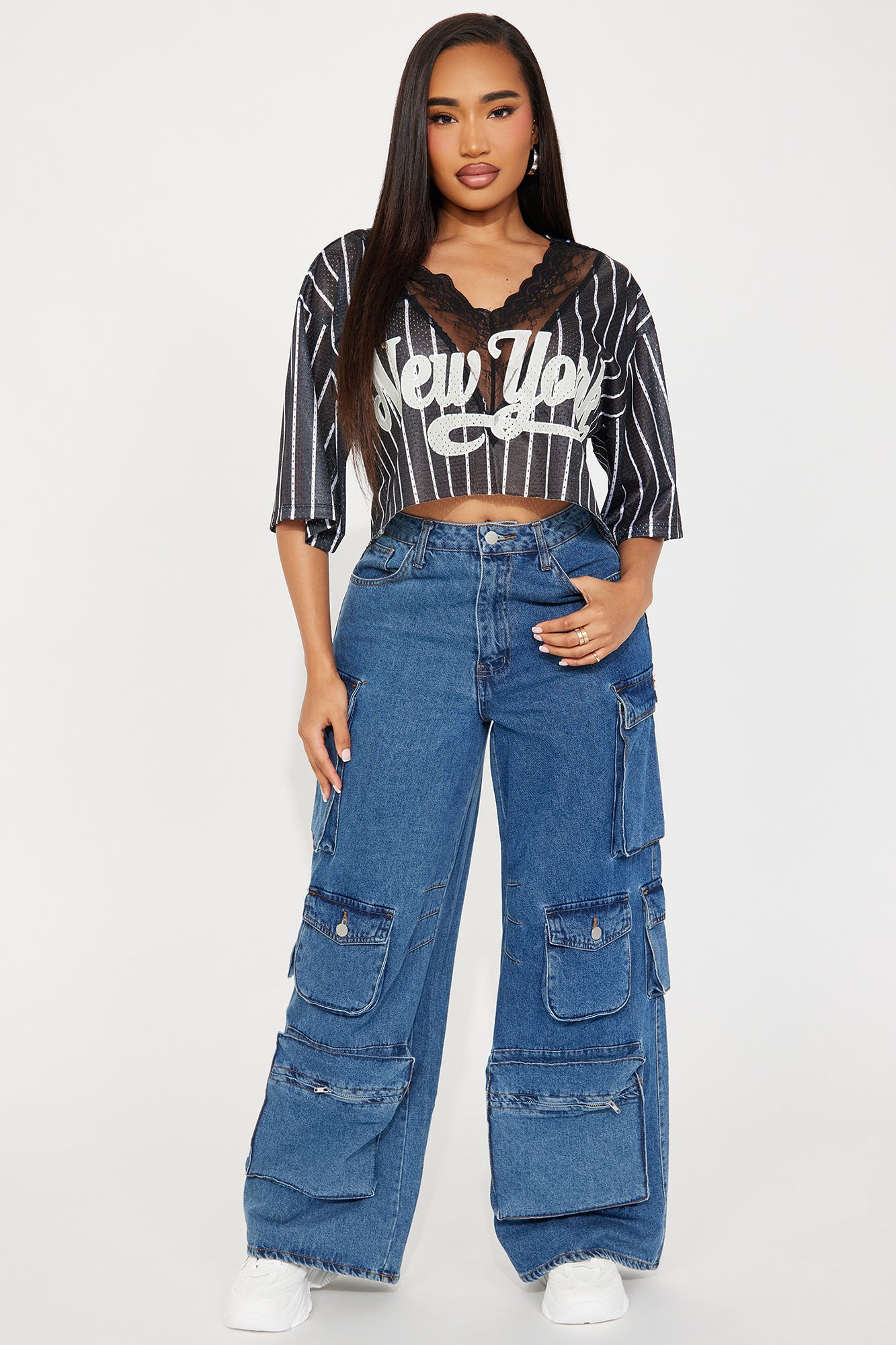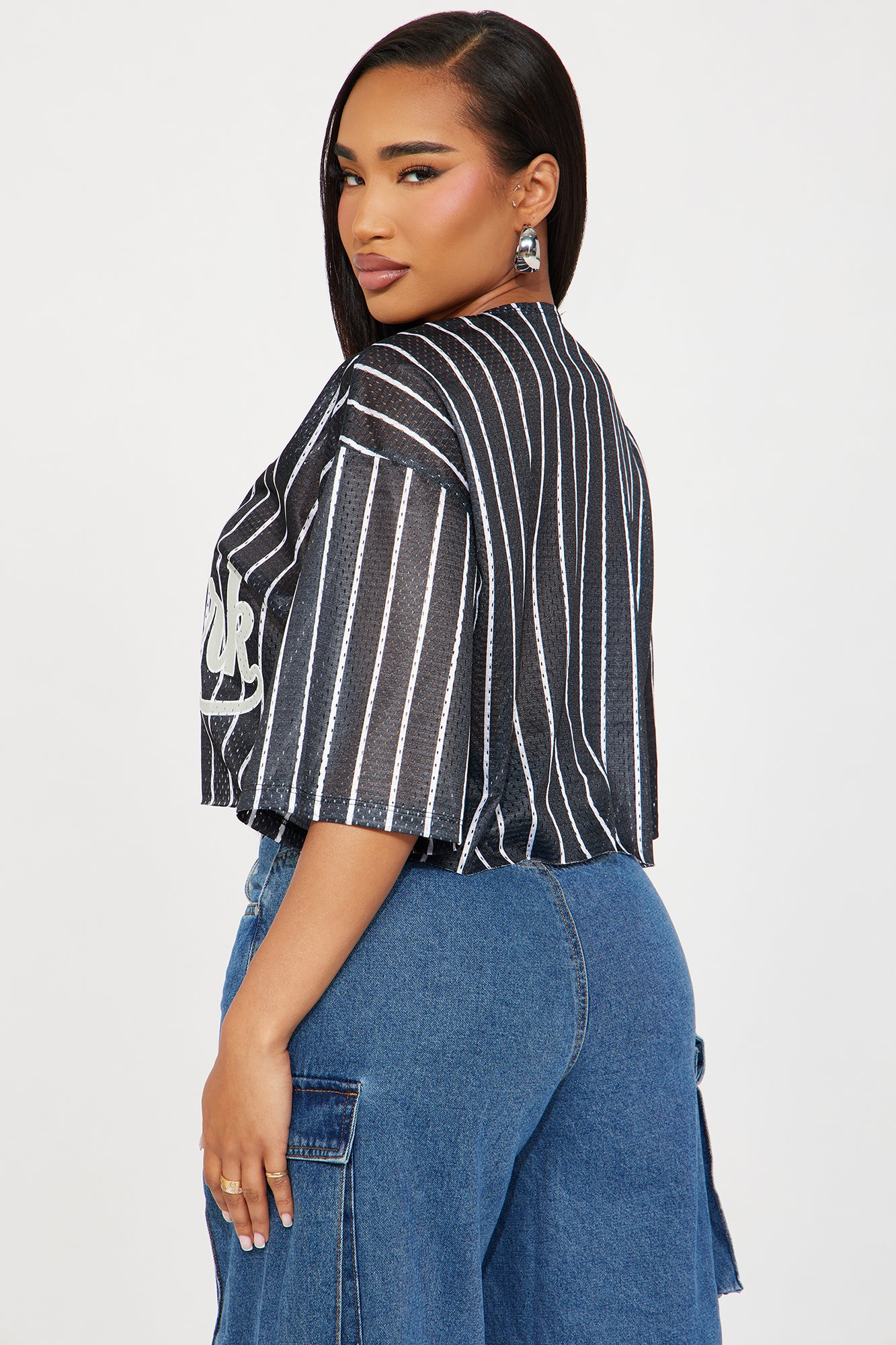 Available In Black/White. V-Neck Short Sleeve Front Screen Lace Trim Detail Cropped Stretch Disclaimer: Due To The Printing Process A Difference In Saturation May Occur. Each Garment Is Unique. 100% Polyester Imported |