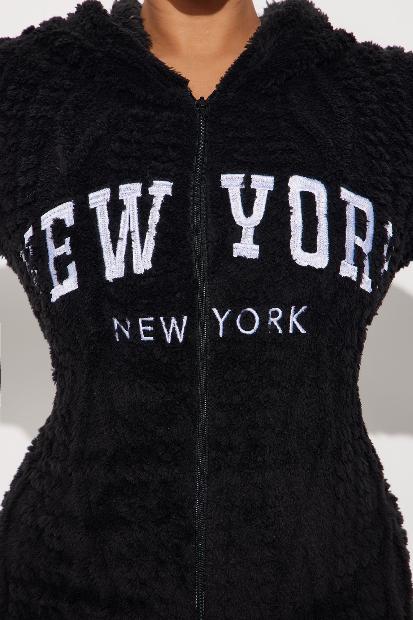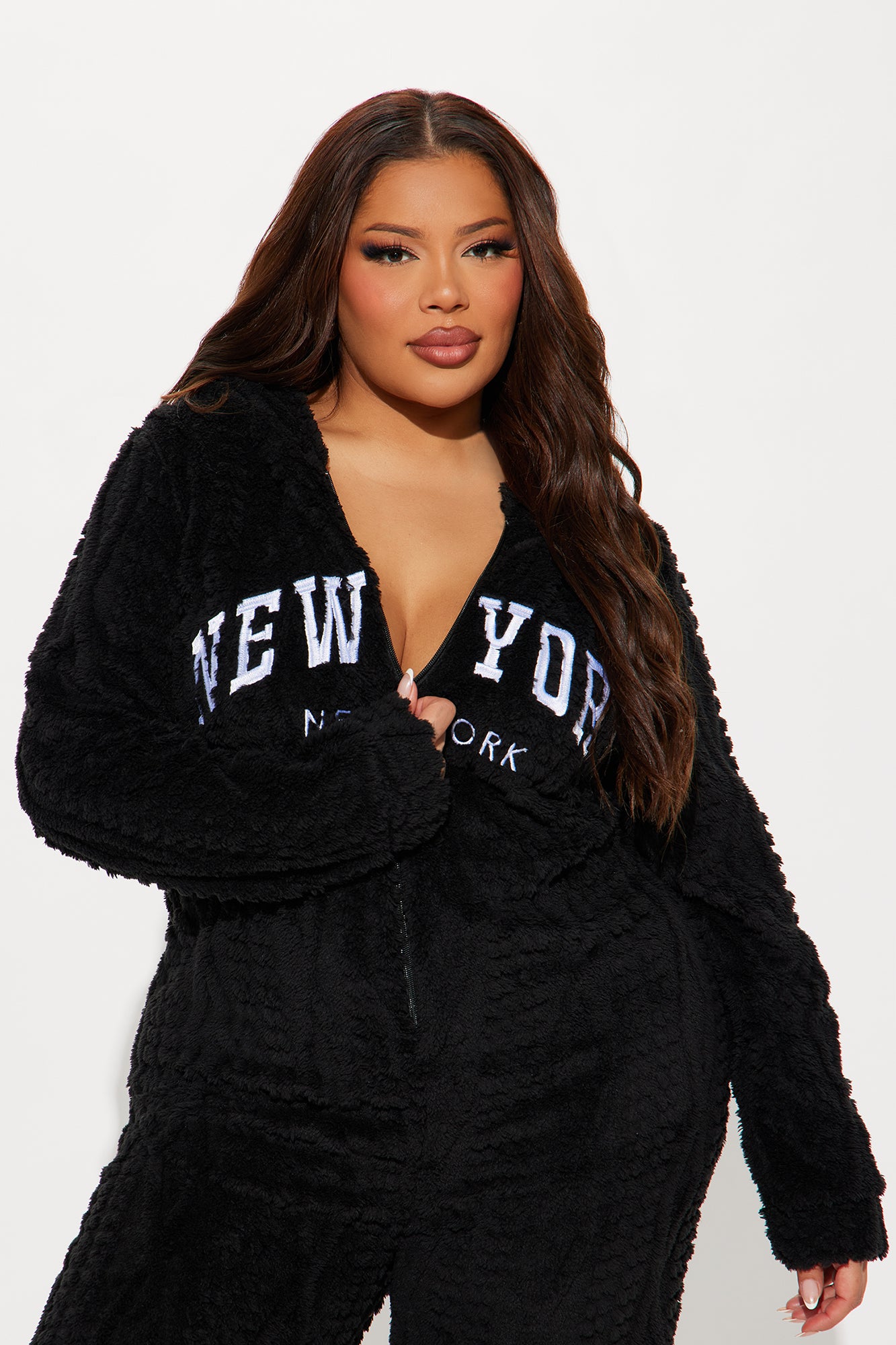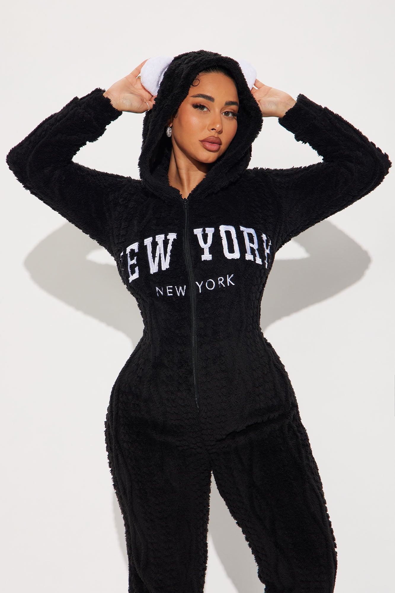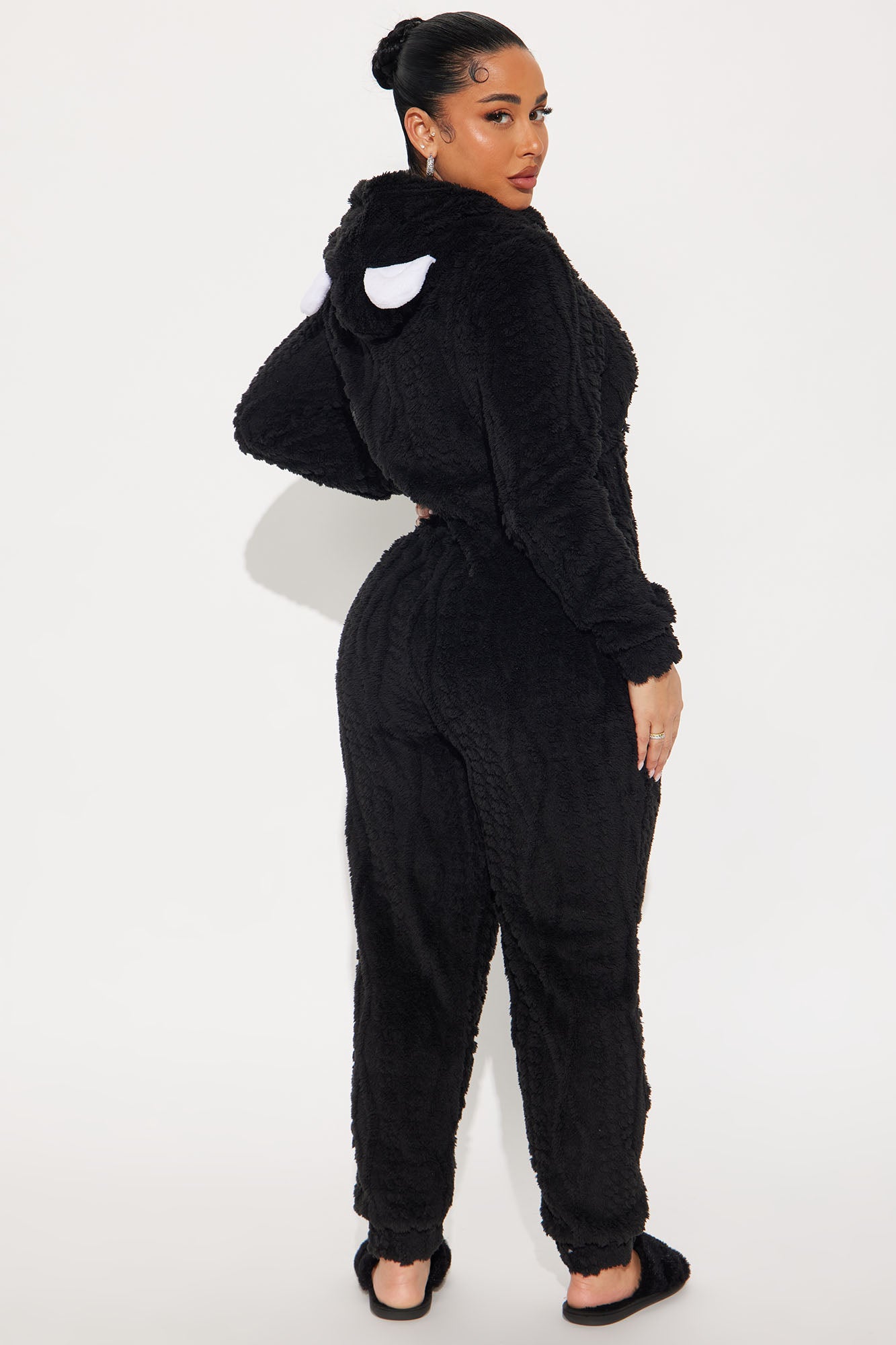 Available In Black. PJ Jumpsuit Onesie Long Sleeve Front Zipper Hooded With Bear Ears Texture Plush Stretch Final Sale 100% Polyester Imported |