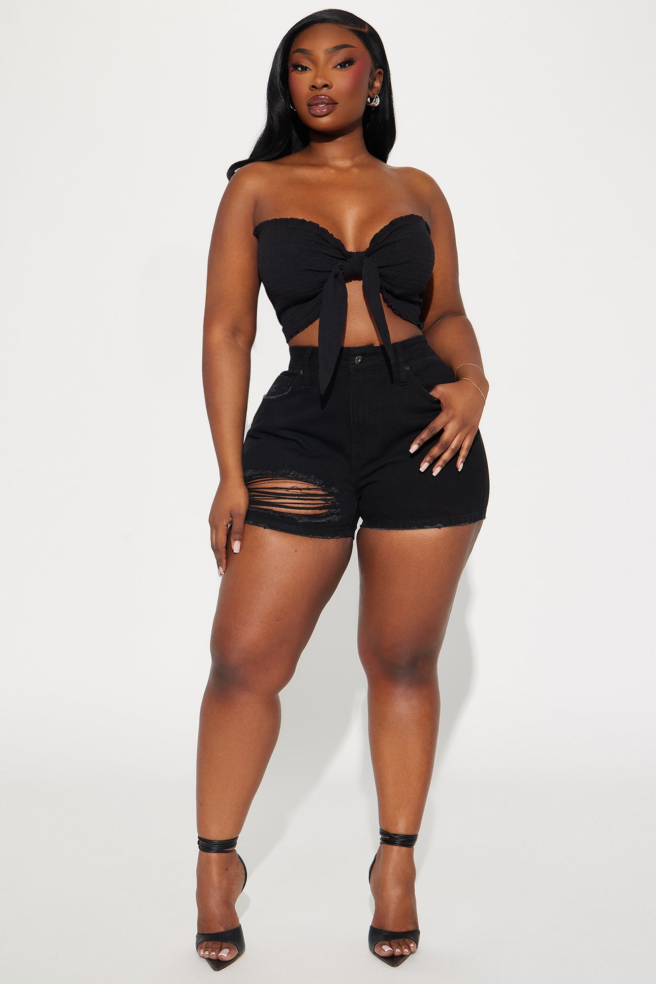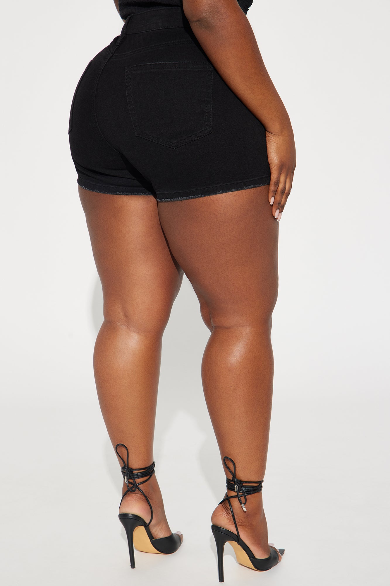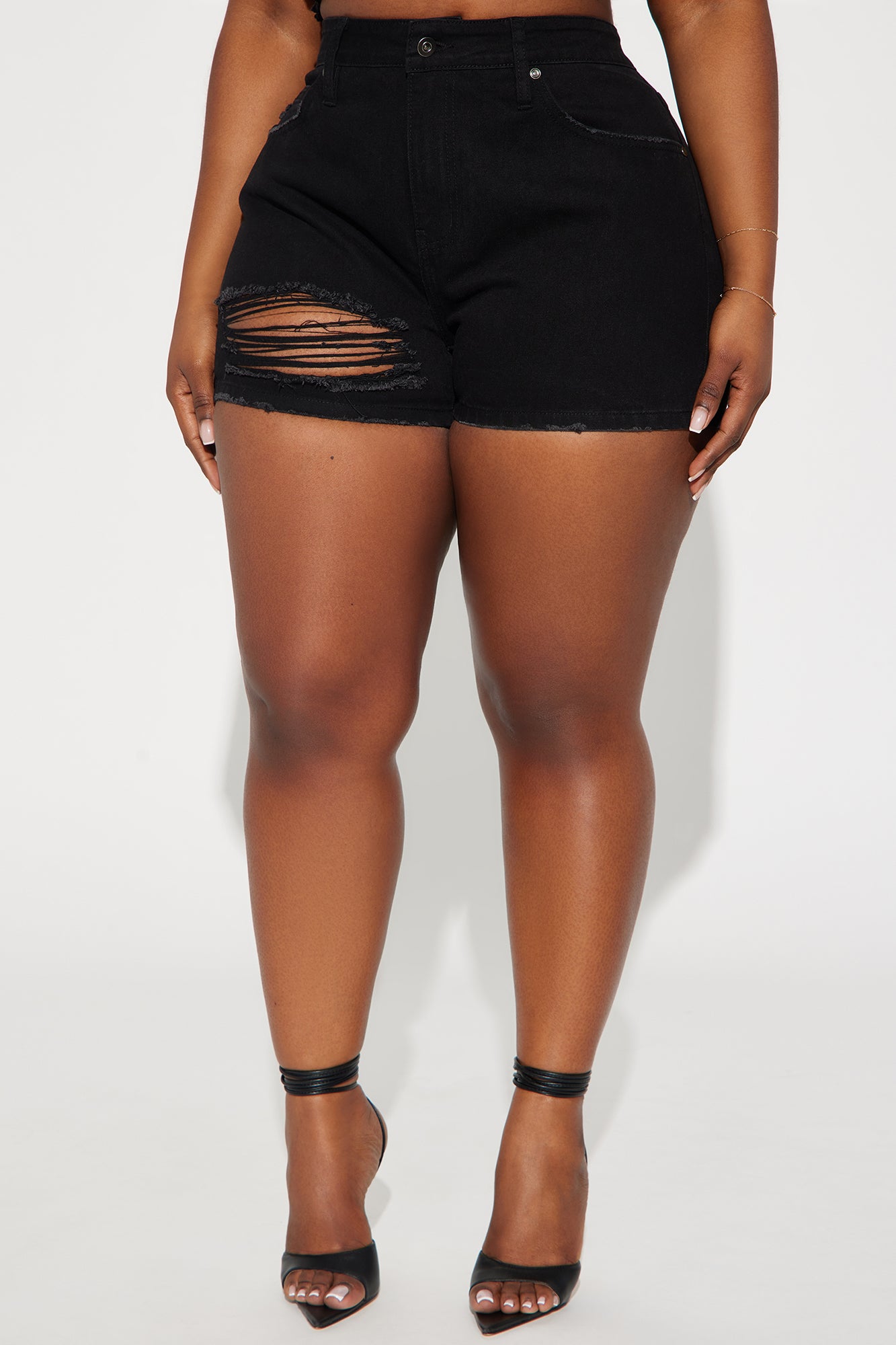 Available In Black. Denim Shorts 11" High Rise 5 Pocket Ripped 3" Inseam Low Stretch Disclaimer: Due To The Specialized Wash & Distressing Process, Each Garment Is Unique. Front: 79% Cotton 21% Polyester Back: 74% Cotton 23% Polyester 2% Rayon 1% Spandex Imported |