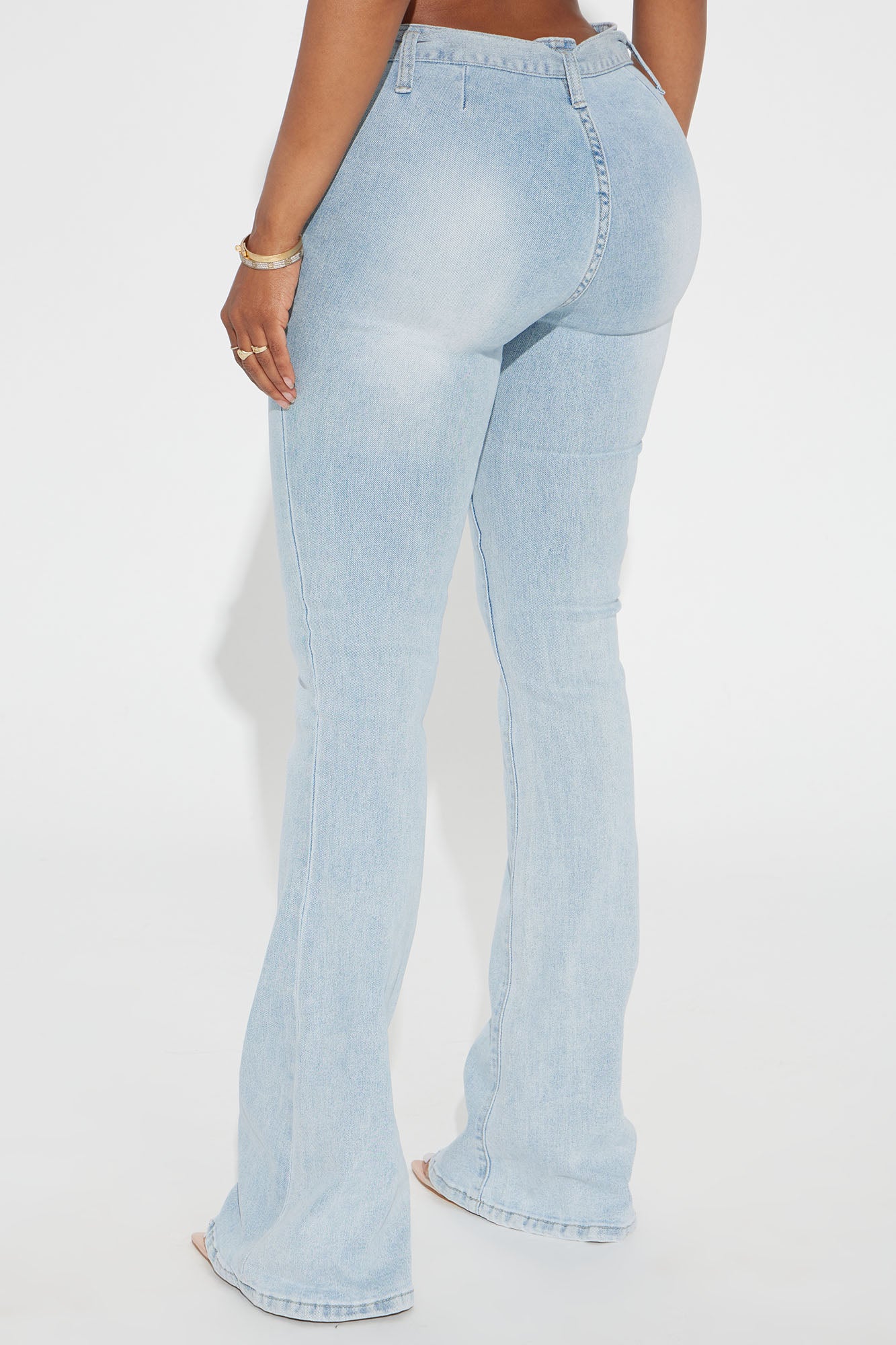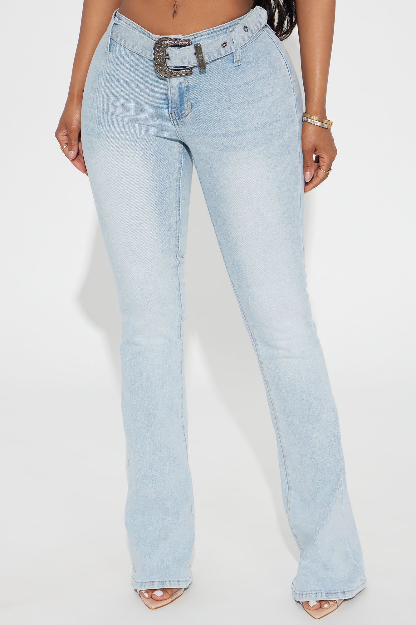 | Available In Light Wash. Flare Jean Belted 8" Low Rise 34" Inseam Low Stretch Disclaimer: Due To The Specialized Wash Process, Each Garment Is Unique. 69% Cotton 26% Polyester 3% Spandex 2% Spandex Imported |