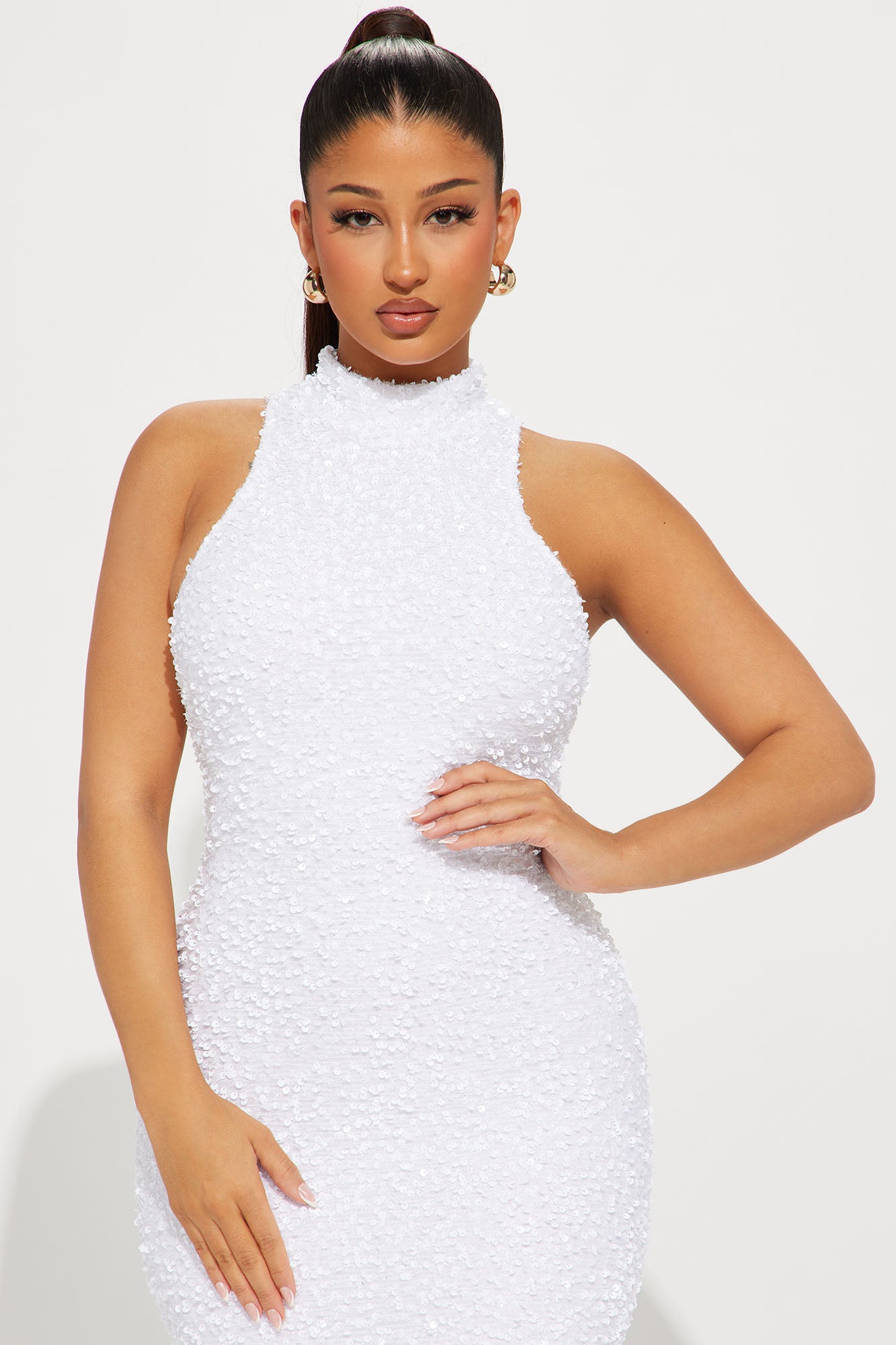 Available In White. Feathered Sequin Gown Mock Neckline Sleeveless Feather Hem Invisible Back Zipper Stretch Self/Lining 2: 100% Polyester Lining 1: 97% Polyester 3% Spandex Imported |